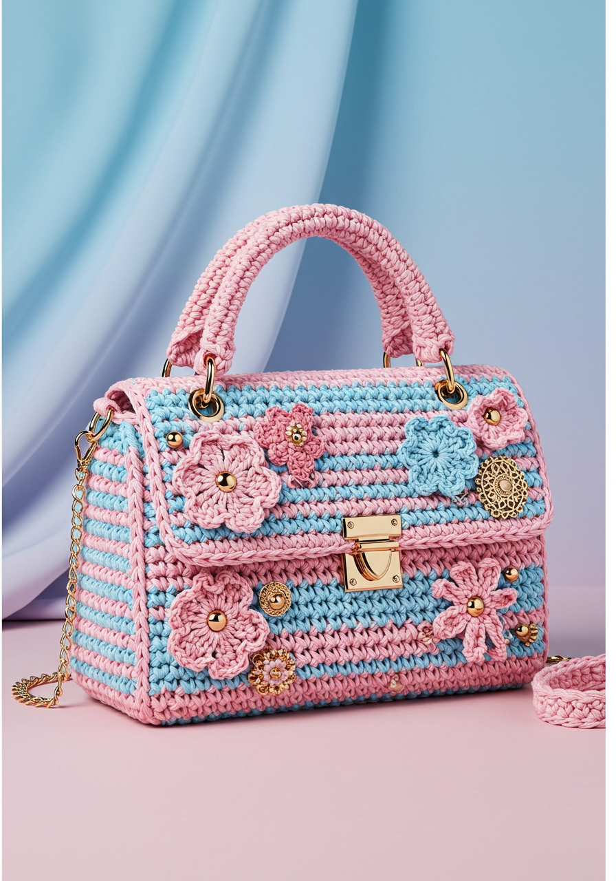 The lighting is soft and studio-quality, emphasizing the texture of the crochet work and the luster of the gold hardware. The background is simple, with the blue fabric providing a cool contrast to the warm pink and blue tones of the handbag.