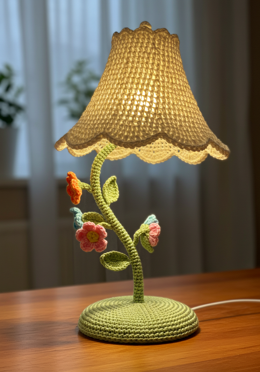A warm, bright light source inside the lampshade is glowing, highlighting the texture of the crochet work and casting a gentle illumination on the immediate surroundings. The light suggests the photograph was taken in dim conditions.
