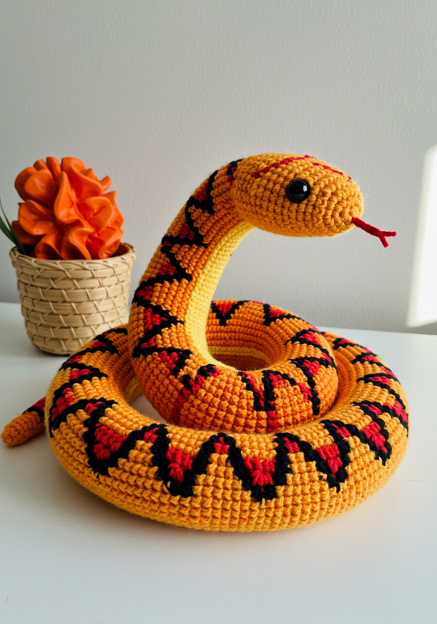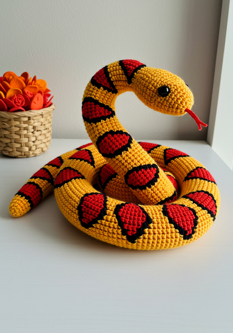 Crocheted snake toy resting on a white, smooth surface against a plain light gray or off-white wall. The snake is predominantly yellow and features a distinct pattern of red, heart-shaped spots outlined in black yarn that wrap around its body. The red markings alternate with the yellow background, mimicking the coloration of a coral snake or milk snake. The snake is posed in a coiled position, with its head raised and curved gracefully upward and slightly to the right. Its eyes are small, black beads, and a tiny, red, forked tongue, made of what appears to be a thin piece of felt or yarn, protrudes from its mouth. The crochet work is tight and uniform, giving the snake a plump, realistic texture. To the left of the snake, slightly out of focus, is a small, light brown wicker basket containing a cluster of faux flowers or decorative elements in shades of orange and red, possibly made of foam or a similar material. The setting suggests a well-lit indoor environment, possibly near a window, as subtle highlights are visible on the white surface. The background is simple and uncluttered, drawing full attention to the crocheted snake.