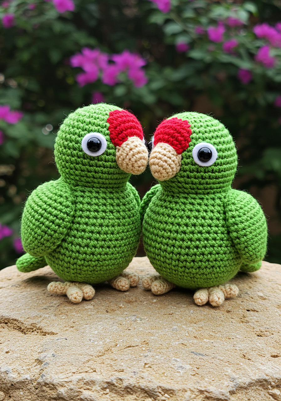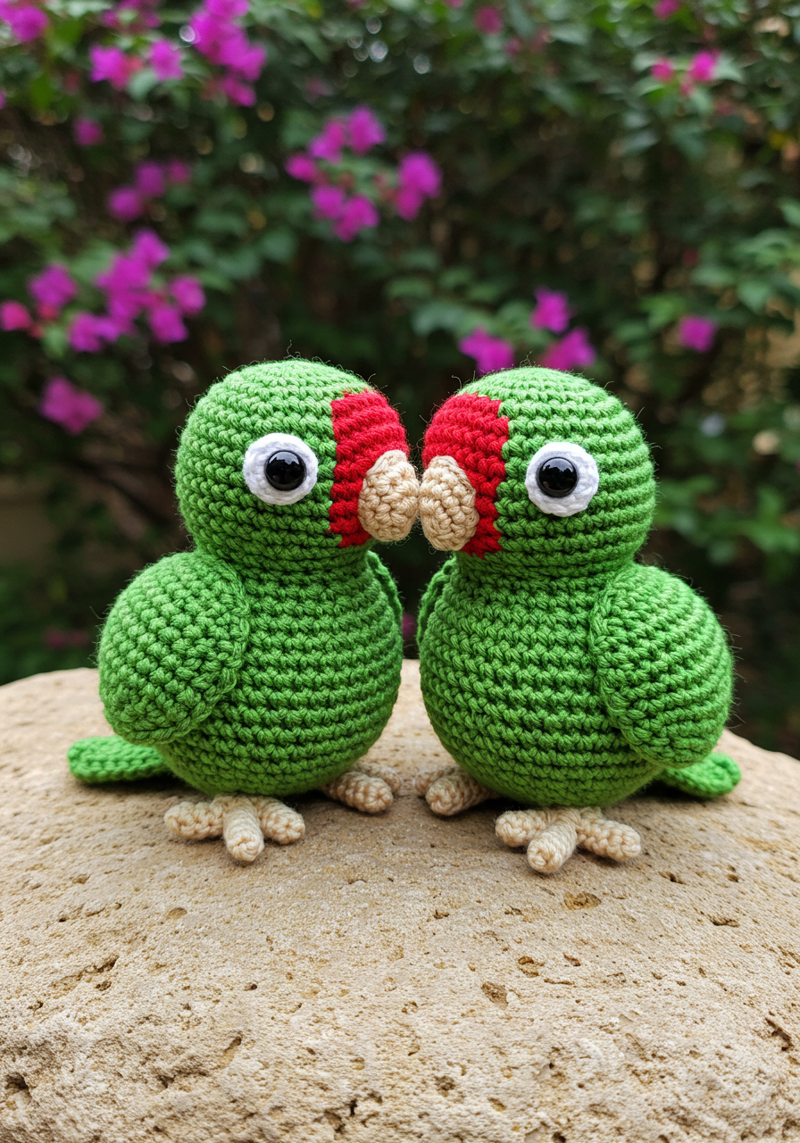 The most distinctive features of the parrots are their faces: a small patch of bright red crochet forms a mask-like area around one eye and extends slightly over the beak area on each bird. The beaks are small and pointed, made from light beige or tan-colored yarn. Each bird has a large, black plastic safety eye that stands out against the green yarn. The two birds are positioned closely together, facing each other, almost touching beaks, suggesting an affectionate pose.