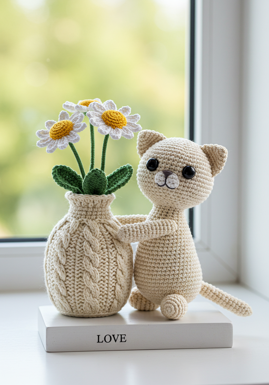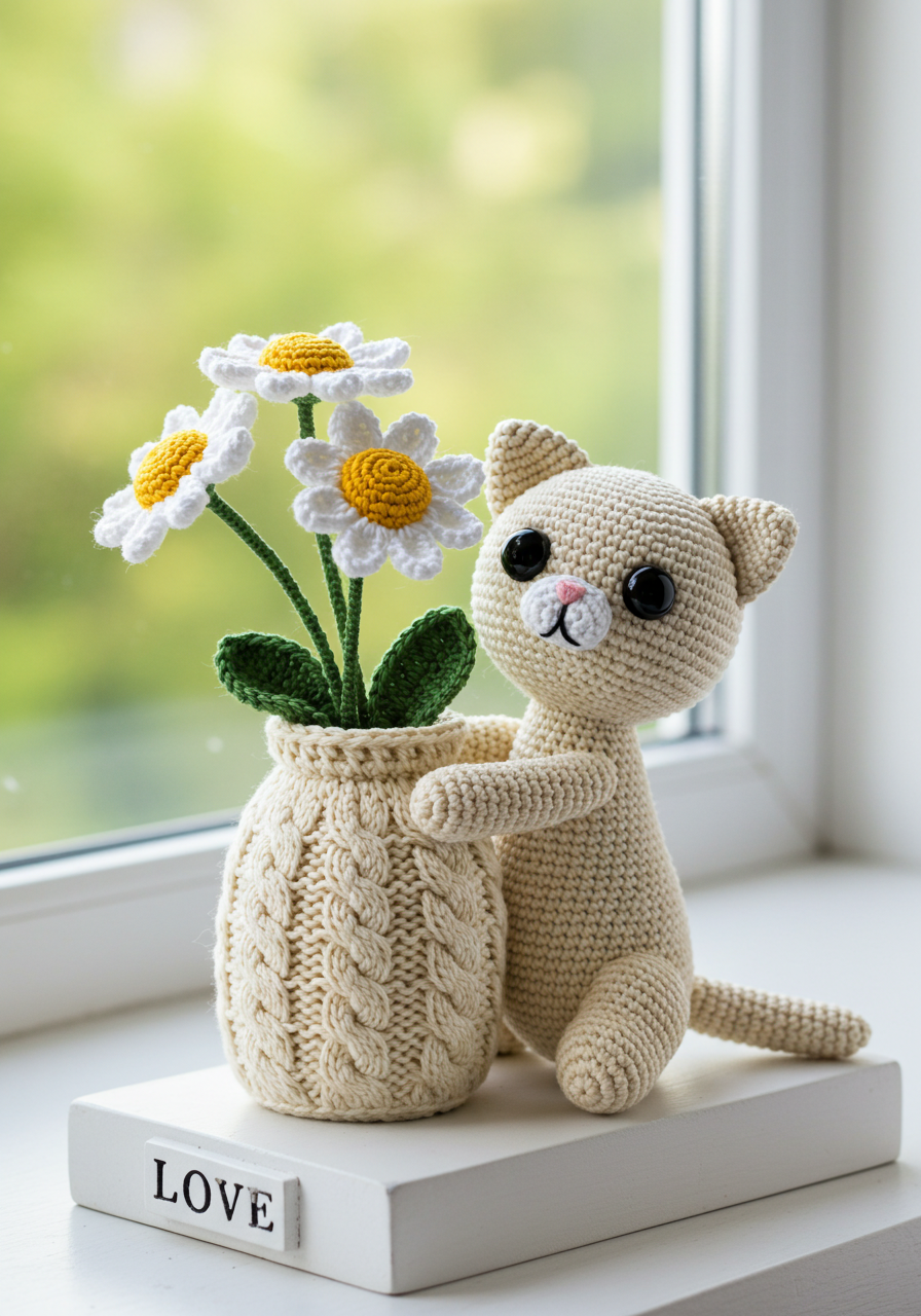Featuring a charming, expertly crafted crocheted cat figurine hugging a matching crocheted vase of daisies, set on a white surface in front of a window. The cat is light cream or ivory, sitting upright with its tail curled, its head tilted slightly upward and to the left with large, black, glossy eyes, and a small pink-stitched nose and mouth. The cat embraces a cream-colored crocheted vase with a cable-knit pattern, holding three crocheted daisies with white petals, bright yellow-orange centers, and green stems and leaves. The cat and vase sit on a thick, white, rectangular pedestal with the word “LOVE” visible on the front edge. The background is a white-framed window with soft, natural light, showing a blurred, overcast outdoors with soft greens and yellows. The image has a shallow depth of field, with the crocheted subjects sharply in focus.