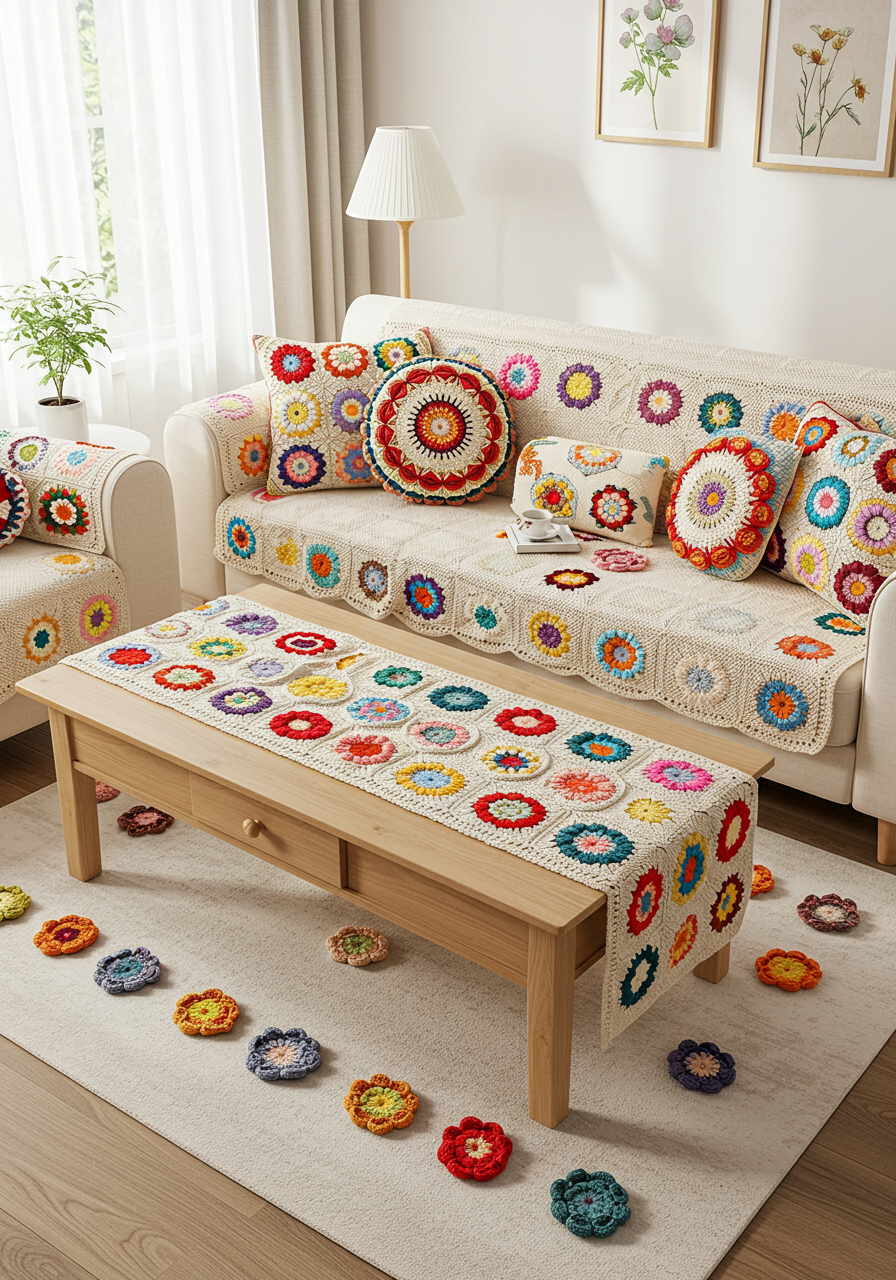 The furniture rests on a light beige or off-white area rug. Scattered on the rug around the coffee table are many individual, colorful, crocheted flower coasters or appliques, mimicking the pattern found on the couch throw and runner. These are arranged randomly around the perimeter of the table, adding to the maximalist, handcrafted aesthetic.