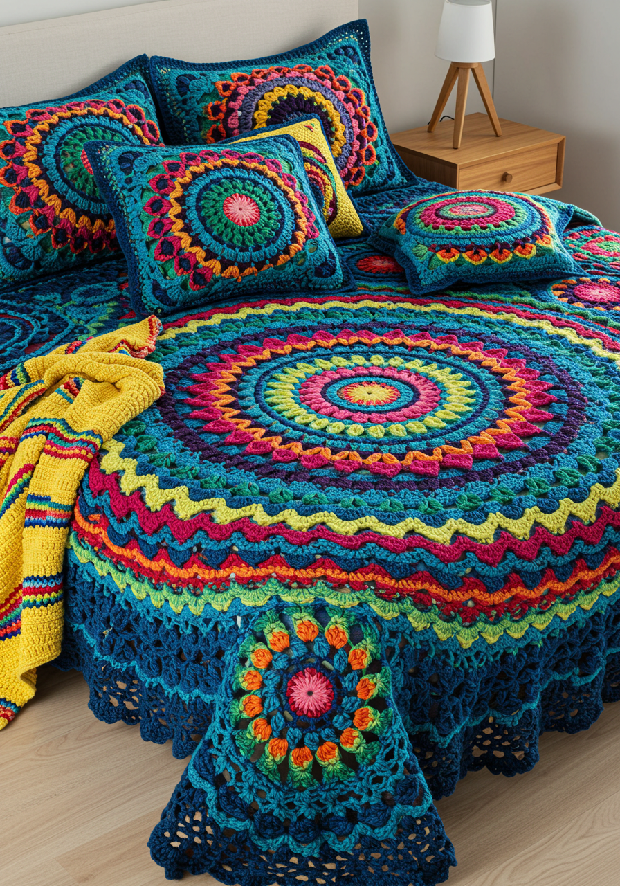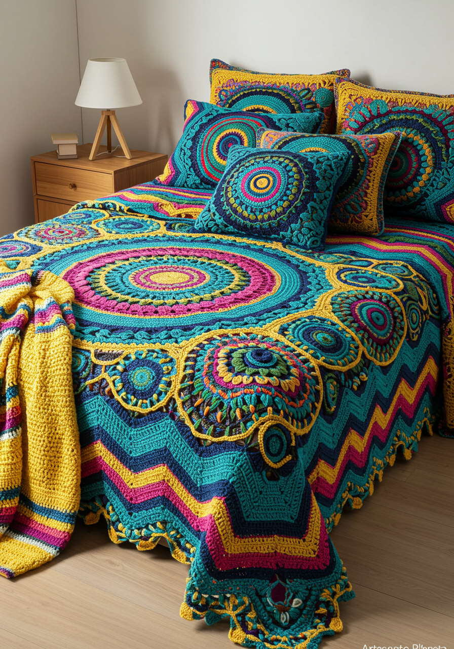 A close-up, high-angle interior shot of a bed covered in a vibrant, intricately crocheted bedspread and matching pillows. The bedspread and pillows feature a kaleidoscope of bright colors, including deep blues, turquoise, emerald green, bright yellow, orange, fuchsia, and red, arranged in complex circular, mandala-like patterns and chevron stripes. The crochet work is highly textured with thick yarn, giving a three-dimensional, relief effect. The bedspread has a large central circular motif and smaller spirals, with a complex lacework border, pooling slightly on the light wooden floor. Four pillows display matching circular and chevron designs. A yellow and multicolored striped crochet throw is draped at the foot of the bed. A wooden nightstand with a modern lamp is visible to the left, casting a warm light. The room features a clean, minimalist aesthetic with light-colored walls. A watermark reading “Artesanato Planeta” is in the lower right quadrant of the bedspread.
