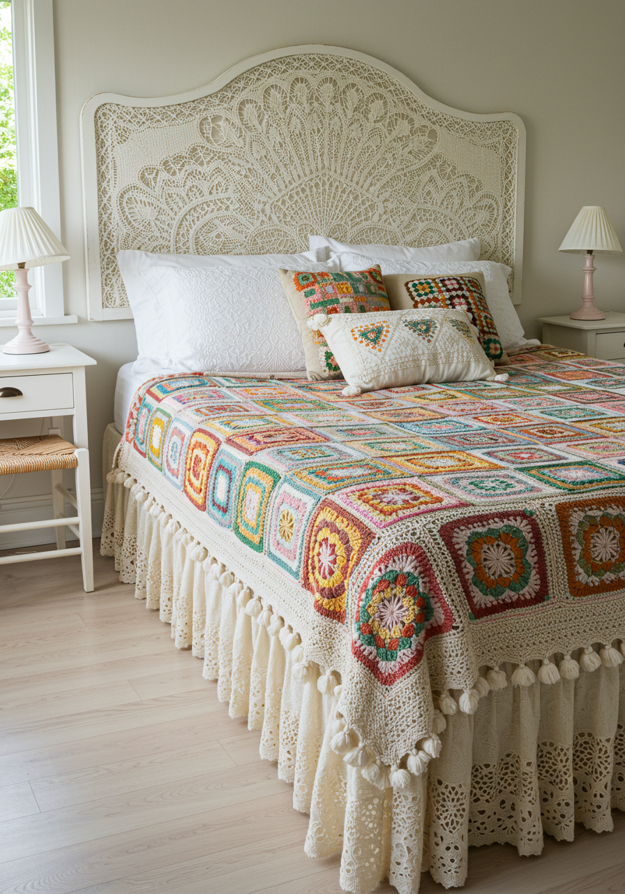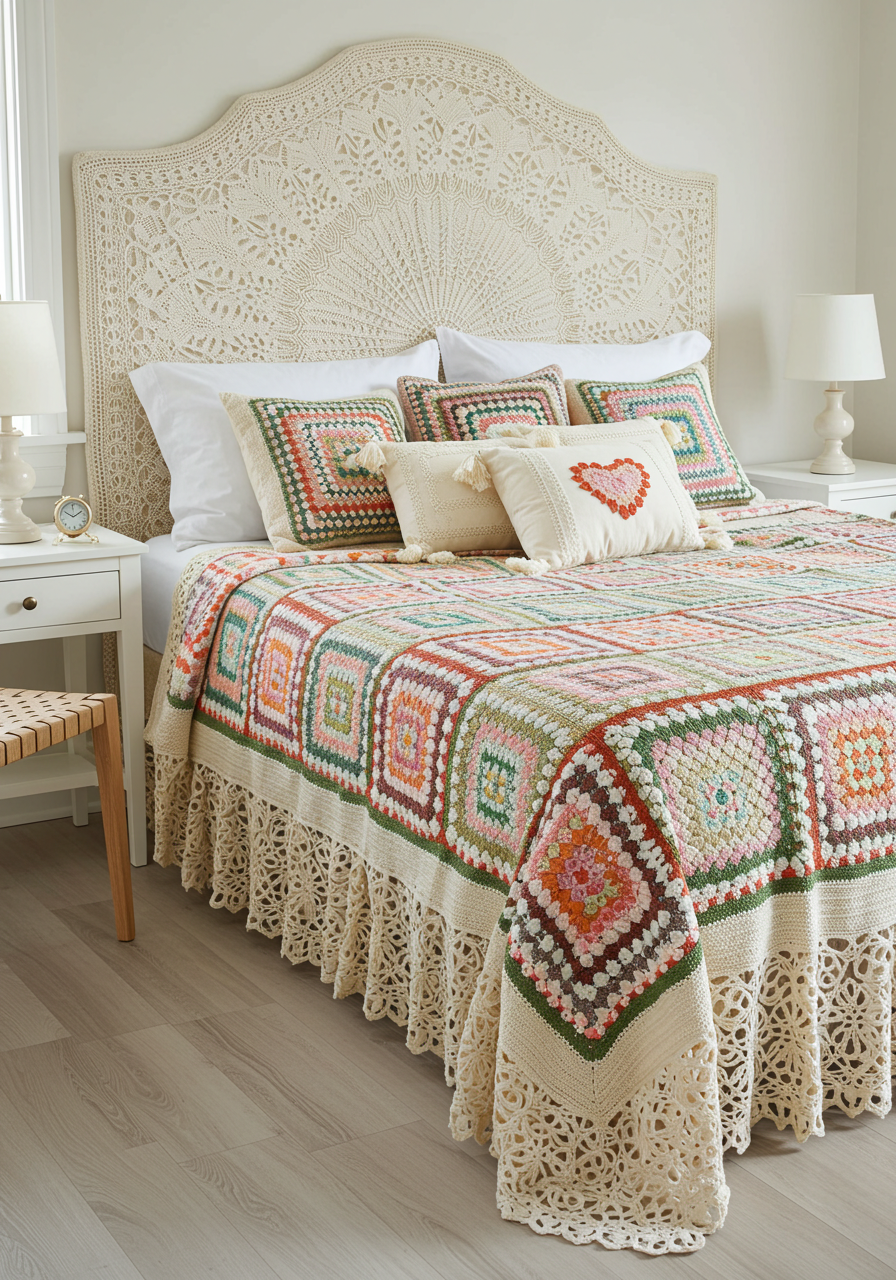 A brightly lit bedroom features a large bed against a plain wall, receiving natural light from a window on the left. The bed has a white or light-colored frame and is adorned with a full-length, cream-colored crocheted bed skirt featuring deep open lacework and small pompoms. The headboard is a wide, cream-colored crocheted panel with intricate lacework and a repeating fan motif. The bed is covered by a large, square-patterned afghan with concentric squares in soft pastels and muted earthy tones like pink, green, rust, orange, white, and sage, finished with a wide cream border. Numerous white or cream-colored pillows rest against the headboard, including two small rectangular white crocheted throw pillows and two square pillows with colorful crocheted designs—one geometric and one with an orange heart shape. To the left, a white wooden nightstand holds a pale pink or cream table lamp. Next to it is a simple wooden chair with a woven seat. The flooring is light-colored wood. The overall aesthetic is cozy and shabby chic.