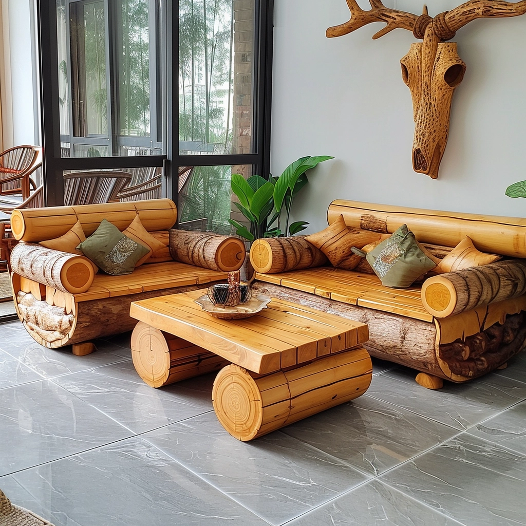 Convertible Comfort: Dive into the realm of practical versatility with a wood log couch set that seamlessly combines rustic charm with convertible comfort. This innovative design not only redefines the conventional notion of seating but also introduces an adaptable element that aligns with the dynamic needs of modern living. Picture a log daybed or a sectional with modular components, providing the freedom to rearrange the furniture to suit diverse occasions and spatial configurations. The transformative nature of convertible comfort not only enhances the practicality of the wood log couch set but also invites a sense of creative freedom, enabling inhabitants to curate their living space according to evolving preferences. It’s not merely a couch; it’s an invitation to shape your environment in harmony with the ebb and flow of daily life, offering both comfort and flexibility in a seamlessly integrated design.
