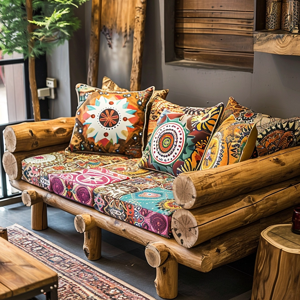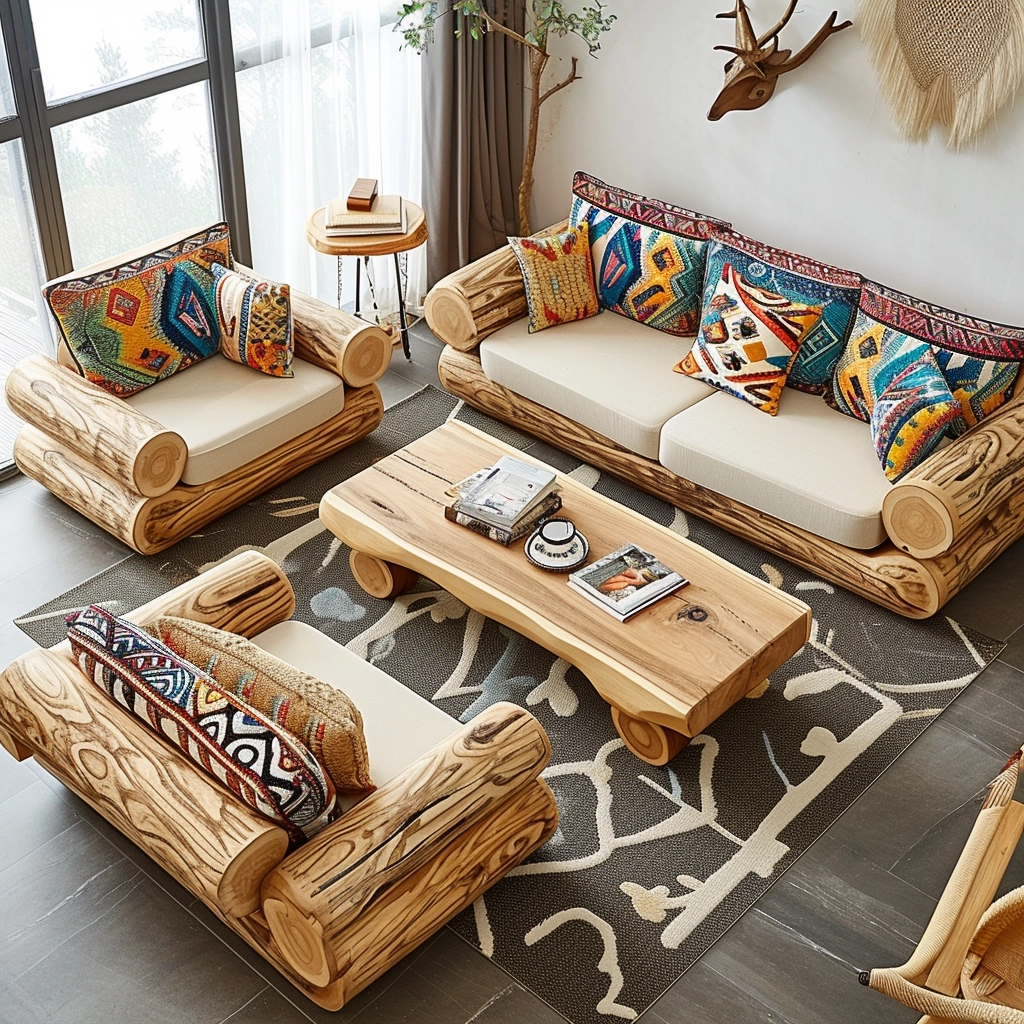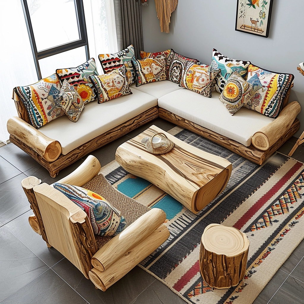 Cushion Variety: Wood log couch set into a canvas of creativity by exploring the world of cushion variety. Picture a diverse array of cushions, each boasting different patterns, textures, and colors, adorning the rustic seating ensemble. Earthy tones, plaids, or prints inspired by southwestern aesthetics contribute to a cohesive yet eclectic look, inviting inhabitants to revel in the tactile and visual richness of their surroundings. This customizable approach not only adds a layer of personalization to your living space but also allows you to adapt the ambiance to suit changing moods and seasons. The interplay of cushions becomes a form of self-expression, turning your wood log couch set into a dynamic and ever-evolving showcase of style and comfort. It’s an invitation to mix, match, and experiment, creating a living space that reflects your unique taste and celebrates the diversity of design within the rustic framework.